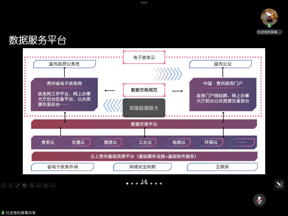 讲座以线上的形式开展,杜逆索从智慧城市的基本定义、特征、人工智能、组成体系等方面阐释了智慧城市的实质和相关知识。接着他从新的视角介绍了智慧城市构建的一般体系架构框架,并分享了“工程监管”、“数据服务平台”、“通村村”、“精准扶贫”、“民生服务”等智慧城市平台构建案例。最后,杜逆索对智慧城市构建理论逻辑进行了总结,强调建设智慧城市在实现城市可持续发展、引领信息技术应用、提升城市综合竞争力等方面具有重要意义。