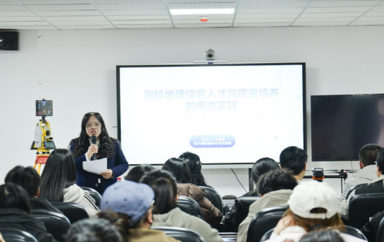 在专题分享环节,袁家秀总经理以“测绘地理信息+人才培养的南方实践”为主题,通过展示“元宇宙智能测绘实训室”建设成果及实景三维生产实践案例,她提出应加速推进智能测绘技术进校园,深化校企协同育人机制,建议员工构建跨学科知识体系以适应产业数字化转型需求。