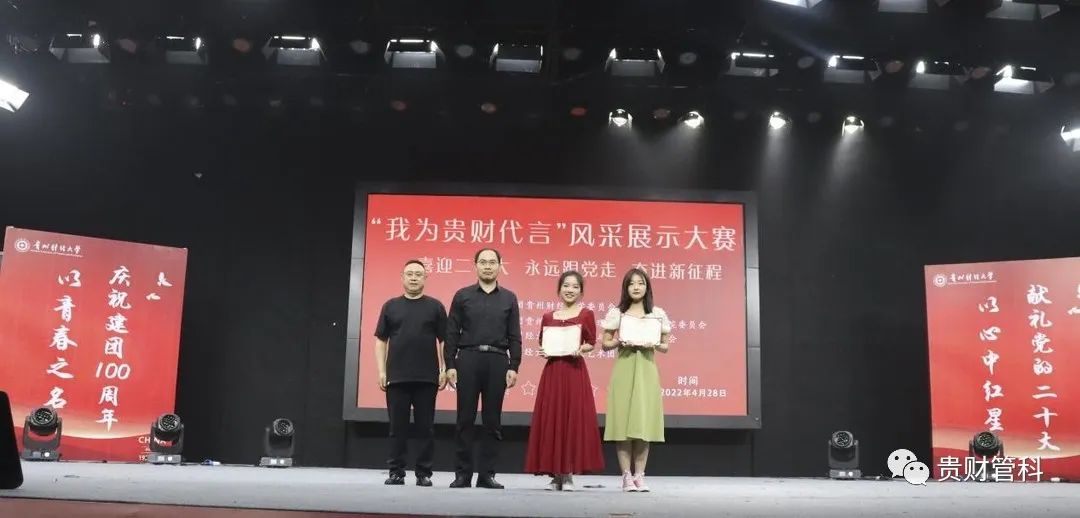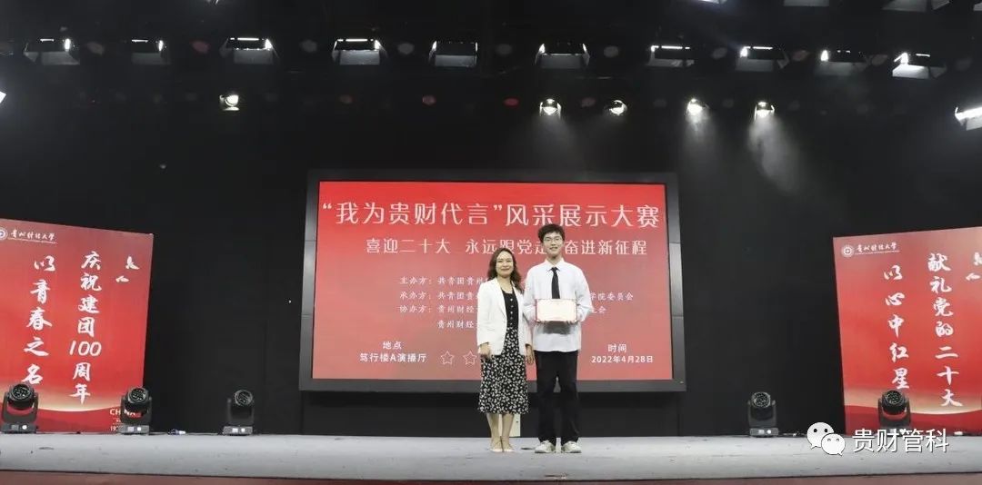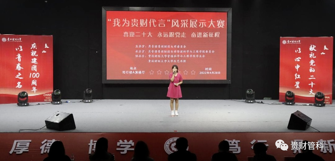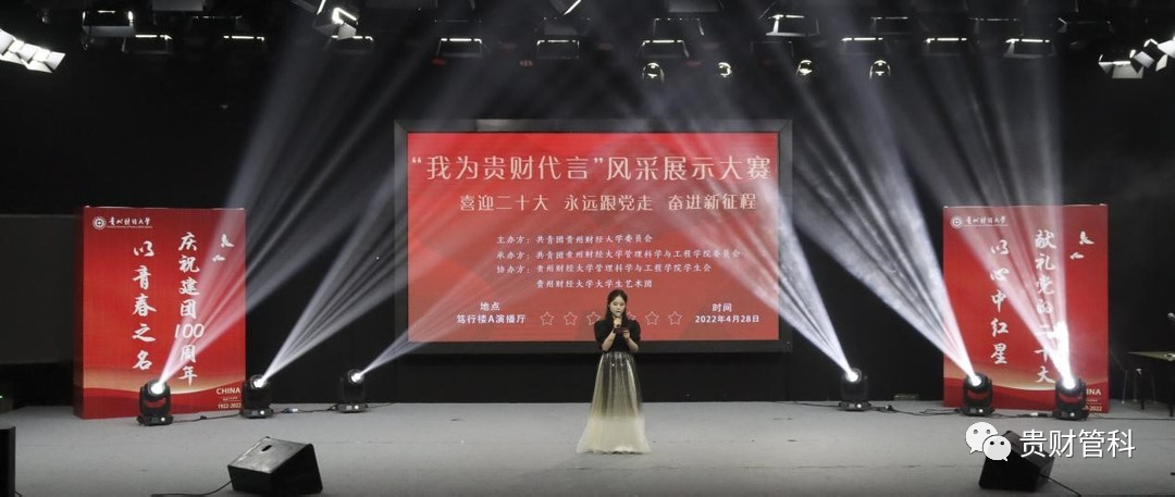 为喜迎党的二十大,丰富大公司园生活,熏陶校园文化环境,展现公司学子风采。4月28日,由校团委主办,williamhill中国官网入口团委承办的“喜迎二十大、永远跟党走、奋进新征程”系列实践活动之williamhill中国官网入口“我为贵财代言”风采展示大赛在笃行楼A栋演播厅举行。williamhill中国官网入口团委书记雍新艳、管理科学与工程公司党委书记邵新顺、williamhill中国官网入口团委副书记贾秋玲、管理科学与工程公司党委副书记张颖、王茜、贵州广播电视台文体旅事业部大型活动电视导演马伟瓒、贵州广播电视台资深媒体人冯艳丽出席参加,公司各院百名学子共同观看比赛。