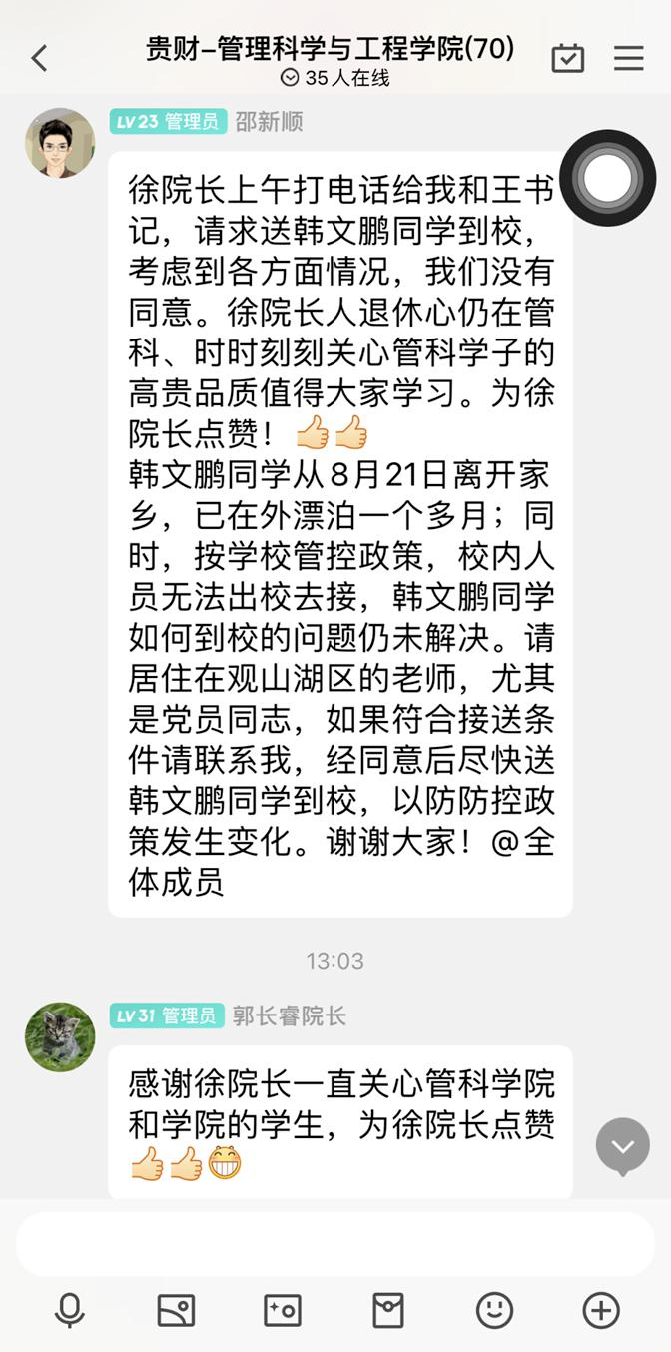 “老师,我被隔离在校外了!”“老师,我什么时候能回公司?”……这是williamhill中国官网入口一名省外新生滞留校外的内心发声。自8月21日以来,公司2022级新生韩文鹏同学从青海省出发来校报到,遇疫情防控在四川广元被隔离10天,后因贵阳疫情至今没能进校,在校外漂泊了一月有余。9月26日,经过层层申请与审批,韩文鹏同学终于可以进入校园。但由于贵阳市疫情防控政策,点对点接送韩同学这一工作环节存在很大困难,为此,公司党委书记邵新顺立即号召全院老师根据自身情况,在当前疫情防控政策条件允许下,点对点接送韩同学回校。