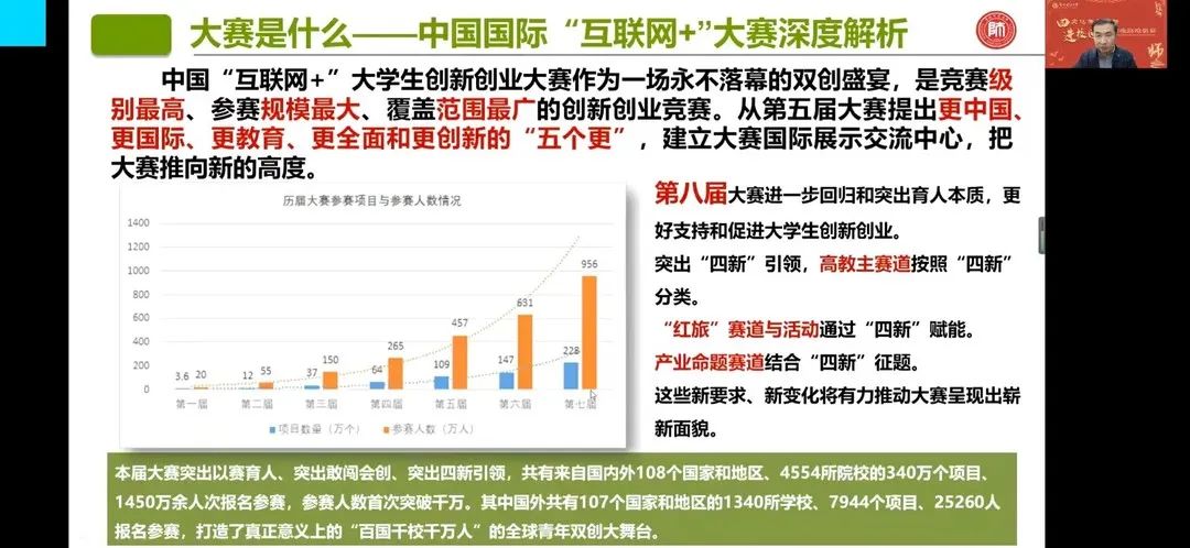 活动伊始,齐松以第七届中国国际老员工创新创业大赛宣传视频为切入点,从国家政策支持和资源保障的角度,结合多个国发创新创业文件、“互联网+大赛”文件分析指出创新创业的重要性。讲座中,齐松从“大赛是什么”、“为什么参加”、“如何准备”以及“复盘国赛金奖项目”四个方面对中国国际“互联网+”大赛进行深度解析,向我们说明中国国际“互联网+”大赛是竞赛级别最高、参赛规模最大、覆盖范围最广的创新创业大赛。同时,从横向与纵向两个维度向我们剖析了第八届中国国际“互联网+”大赛在原有基础上做出的改变与创新,并谈到“大赛是平台,聚拢海量资源;大赛是舞台,汇集社会美誉”。此外,齐松结合国赛金奖项目,鼓励同学们积极参加创新创业大赛,教大家从“创业员工运营项目、在校员工创意项目、新兴技术驱动项目”等八个优质项目着手备赛,为大家提供了明晰的参赛方向。活动尾声,齐松与同学们进行交流讨论,为大家答疑解惑。