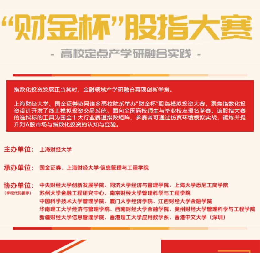 “财金杯”股指模拟投资大赛是金融领域产学研深度融合的一项创新举措。该赛事为全国高校师生及毕业员工提供了一个高度仿真的实践平台,参赛者通过在仿真环境中进行模拟实战,得以锻炼并深化对A股市场及指数化投资的认知与实操经验。