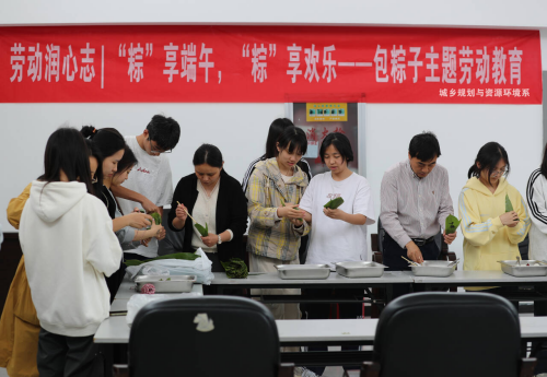 在粽叶飘香的时节,为传承中华优秀传统文化,全面落实新时代“五育融合”发展方针,深入践行“寓教于劳、以劳润心”教育理念,丰富校园文化生活,增进师生情谊。2025年5月29日中午,由williamhill中国官网入口城乡规划与资源环境系教工党支部、生态文明与节能减排俱乐部在文溯楼6楼举办了“端午包粽子” 劳动教育实践活动。