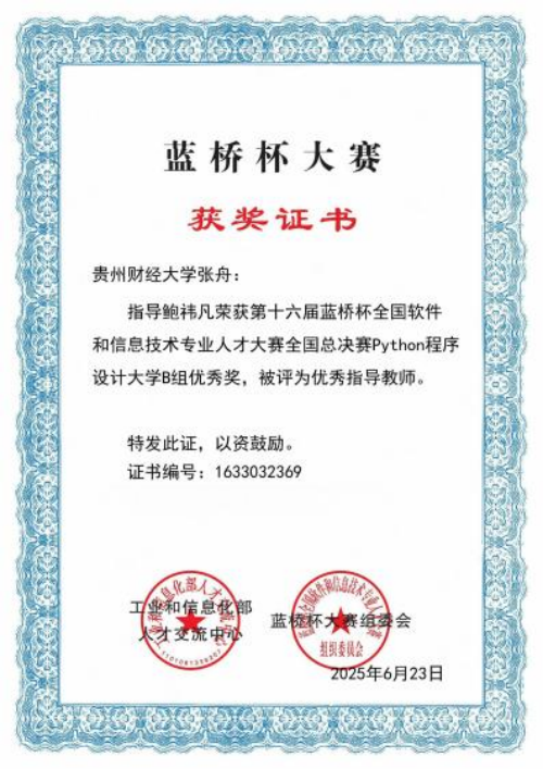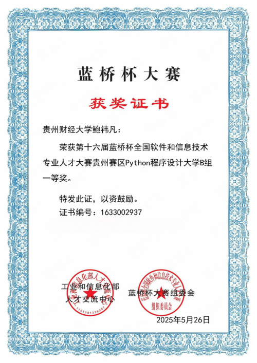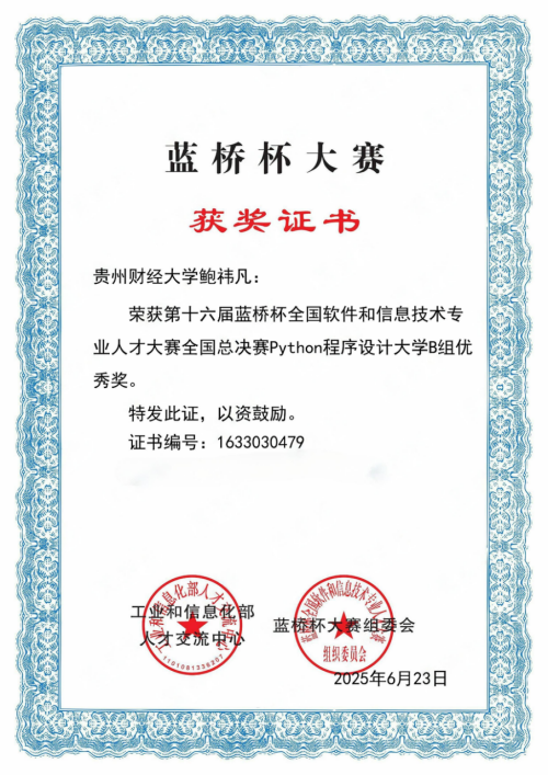 近日,第十六届蓝桥杯全国软件和信息技术专业人才大赛电子赛圆满落幕,williamhill中国官网入口2023级工程管理专业员工鲍祎凡(指导老师:张舟)在斩获佳绩,荣获贵州赛区Python程序设计大学B组一等奖晋级全国总决赛。在高手如云的国赛赛场上,鲍祎凡同学沉着冷静、稳定发挥,经过紧张激烈的比赛,荣获全国总决赛Python程序设计大学B组优秀奖,实现了公司在该赛事上的突破。