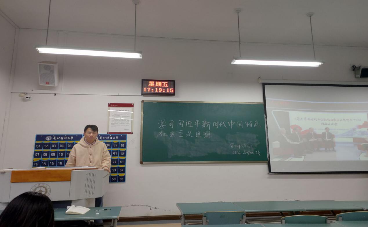首先,由团支书周道向大家介绍“习近平新时代中国特色社会主义思想”的来源和学懂新时代中国特色社会主义思想的丰富内涵。了解习近平新时代中国特色社会主义思想是迈进新时代、开启新征程、续写新篇章的政治宣言和行动指南,是马克思主义的中国化的最新成果,更是实现现代化强国的纲领文件。习近平总书记在十九大工作报告中用了“8个明确”对这一理论创新成果进行了概括,分别从中国特色社会主义的总目标、总任务、总体布局、战略布局和发展方向、发展方式、发展动力、战略步骤、外部条件、政治保证等方面,系统性的回答了新时代坚持和发展什么样的中国特色社会主义、怎样坚持和发展中国特色社会主义这一重大时代课题。